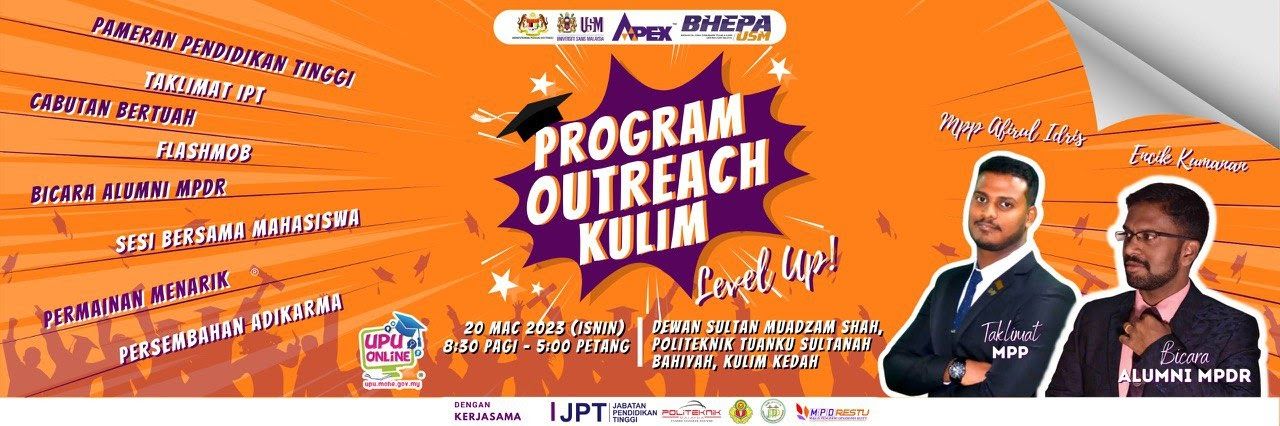 Dengan bertemakan “Level Up”, program ini bertujuan memberi pendedahan kepada pelajar- pelajar sekolah terutamanya pelajar Tingkatan Lima & pelajar Tingkatan Enam, Guru -guru kaunseling berkenaan panduan dan maklumat kemasukan ke Institut Pengajian Tinggi Awam/ Politeknik/Kolej Komuniti khususnya di sekitar daerah Kulim, Kedah & Bertam,Pulau Pinang.