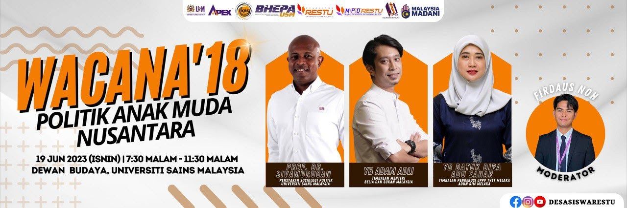 Majlis Penghuni Desasiswa Restu (MPDR) dengan kerjasama Kelab Sains Politik (KeSPol) akan mengadakan Wacana’18: Politik Anak Muda Nusantara pada ketetapan berikut: