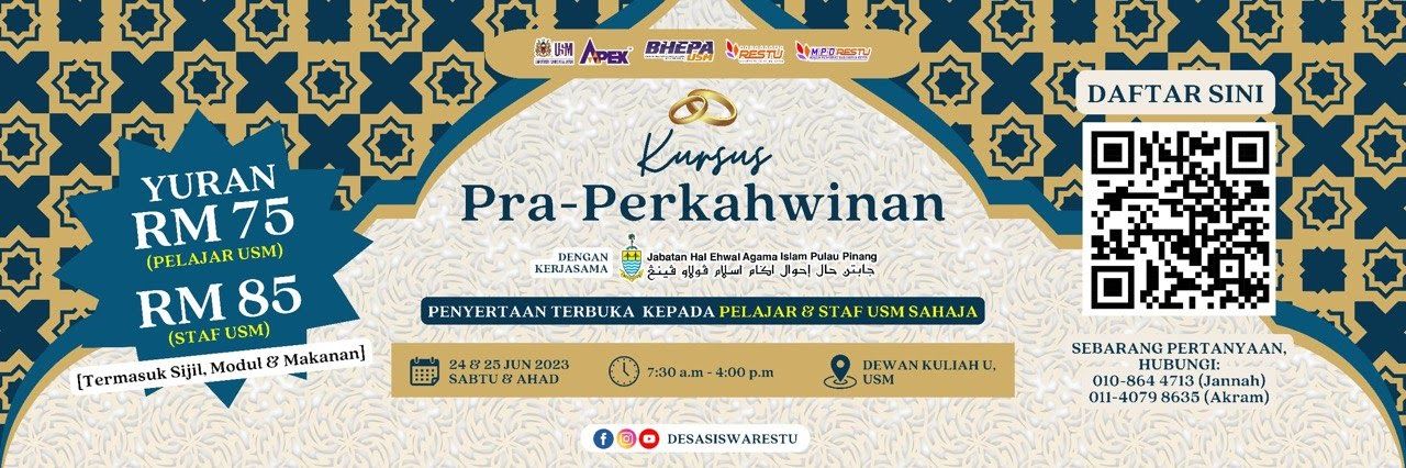 Majlis Penghuni Desasiswa Restu (MPDR) dengan kerjasama Jabatan Hal Ehwal Agama Islam Pulau Pinang (JHEAIPP) akan mengadakan *Kursus Pra Perkahwinan* 👰🏼♀🤵🏼♂ pada ketetapan berikut: