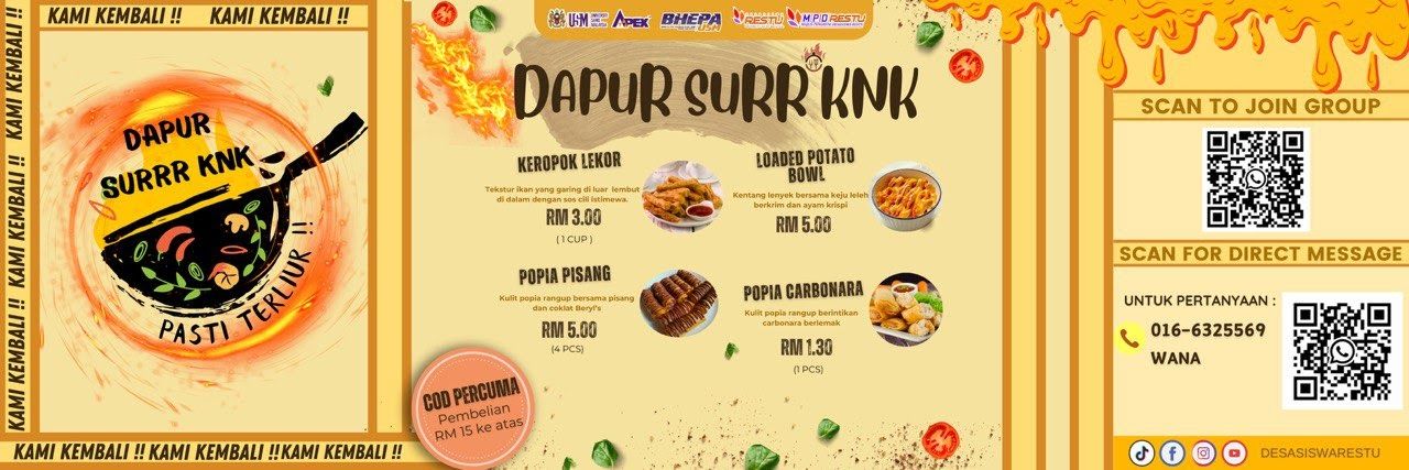 This program will be fully run by MPDR members starting from purchasing cooking ingredients, food preparation processes, and food delivery to customers. The Committee of Dapur Surr KNK will carry out tasks according to the established schedule. Committee members will begin taking orders through the Dapur Surr KNK group channel created on the WhatsApp application, and food preparation will start from 2:00 pm to 8:00 pm on Fridays, Saturdays, and Sundays. Residents can choose two methods of food collection; 'pickup' or 'COD (cash on delivery)'. Subsequently, food delivery will take place from 8:00 pm to 10:00 pm to all customers. This program targets all residential students within USM who wish to experience the variety of menus that we have set.